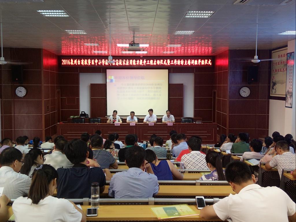 7月5日,泉州台商投资区中小学教师信息技术应用能力提升工程启动仪式暨工作坊坊主培训班在泉州惠南中学举行开班仪式。福建广播电视大学副校长陈展虹、培训学院副院长江克英,泉州台商投资区管委会教育文体旅游局局长王子文、组织人事科科长郭美贤及泉州台商投资区管理者、骨干教师(坊主)等131人出席了开班仪式。仪式由郭美贤主持。