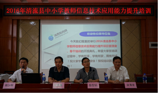8月26日上午,2016清流县中小学教师信息技术应用能力提升工程项目管理者、骨干教师培训开班仪式在清流县教师进修学校举行。培训学院副院长江克英、清流县教育局副局长伍仕钊、清流县教师进修学校校长涂清发、副校长赖汉郎及清流县各校校长、管理者、骨干教师总计110多人出席了开班式。仪式由赖汉郎主持。