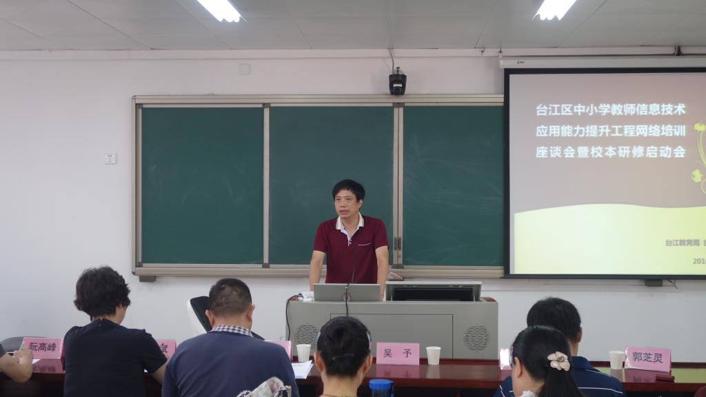 9月30日上午,台江区中小学教师信息技术应用能力提升工程网络培训座谈会暨校本研修启动会在台江区教师进修学校召开。福建广播电视大学培训学院副院长江克英、台江区教育局副局长、区工程办负责人吴予、教育局人事科长赵佳、台江区教师进修学校校长李燕斌、区督学郭芝灵、浙江师范大学网络继续教育学院院长助理阮高峰以及台江区各学校分管校本研修的主任、教研员及学科工作坊优秀代表共计70人参加了会议。会议由教师进修学校培训处林冰老师主持。