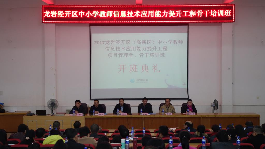 2月28日上午,龙岩经开区(高新区)中小学教师信息技术应用能力提升工程管理者、骨干教师培训班在坎市中学正式拉开帷幕。福建广播电视大学培训学院副院长江克英、浙江师范大学教授夏洪文、龙岩市经济技术开发区主任科员赖敏麟、教育办副主任余建斌、初教工作组组长王小莉、坎市中学书记阙永和、分管培训管理者、骨干教师以及工作坊坊主共计145人参加开班式。余建斌主持会议。