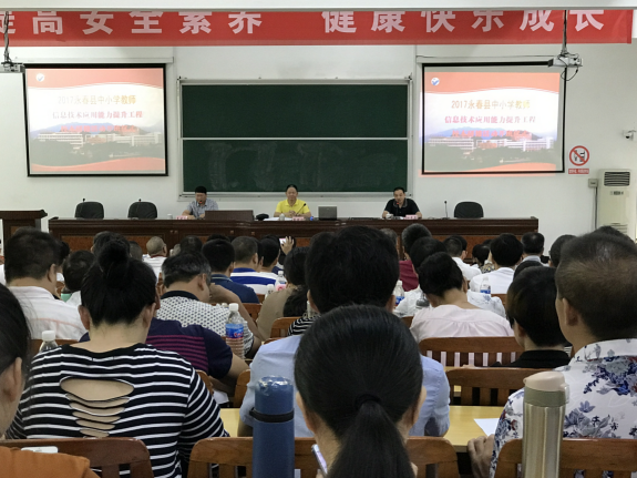 11日上午,永春县中小学教师信息技术应用能力提升工程校本研修骨干、管理者培训班在永春县职业中专学校举行开班仪式。福建广播电视大学培训学院副院长江克英,永春县教育局副局长蔡明福、永春县教师进修学校副校长李建义及全县信息技术应用能力提升工程各学校项目管理员、坊主等326人出席了开班仪式。仪式由李建义主持。