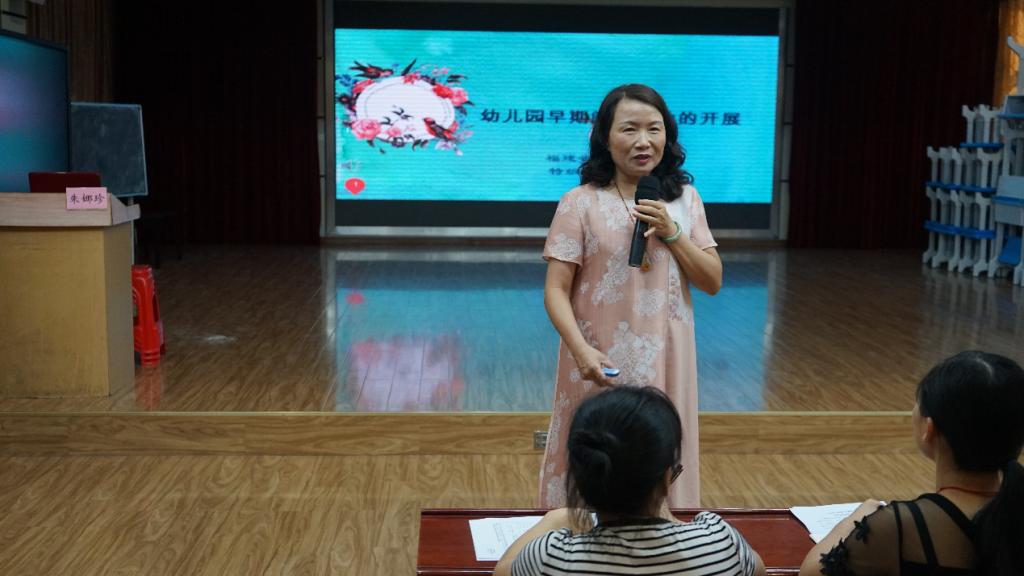 开班仪式后,福建省金山幼儿园园长朱娜珍与参训教师分享了《幼儿园早期阅读活动的组织与开展》专题讲座。朱园长从早期阅读的价值剖析、环境的有效开发、材料的有效利用、活动的组织与实施这四个方面分别展开。整场讲座既有理论概括,又有案例分析,具有很强的指导性。