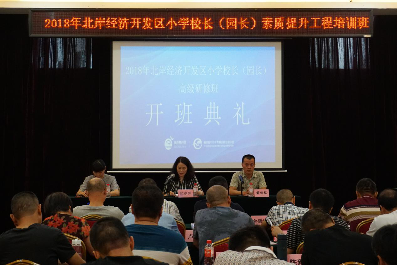 8月7日上午,2018北岸经济开发区小学校长(园长)素质提升工程培训班在厦门市维洛拉大酒店举行开班仪式,福建广播电视大学培训学院副院长欧雅洪、莆田市湄洲湾北岸经济开发区教育局纪检监查室负责人黄俊棋,福建广播电视大学海西教育网培训部老师阙桂华及参训的52位各小学正副校长、校级领导、各幼儿园正副园长一同出席开班式,仪式由阙桂华主持。