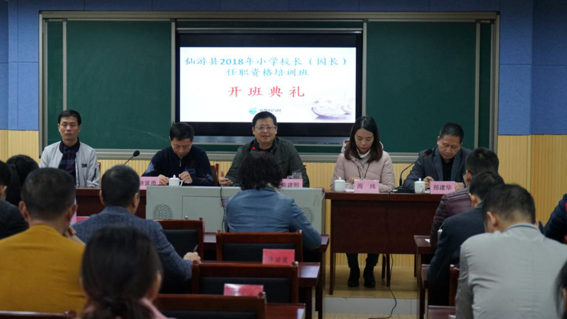 12月17日上午,仙游县2018年小学校长(园长)任职资格培训班在仙游县教师进修学校举行开班仪式。仙游县教育局副局长、教育督导室主任陈建熙、教育局人事股股长朱明荣、仙游县教师进修学校校长、书记徐富勇、福建广播电视大学海西教育网远程培训部主任周玮及仙游县各校参训校(园)长共计68人参加开班式,开班仪式由仙游县教师进修学校副校长郑建华主持。