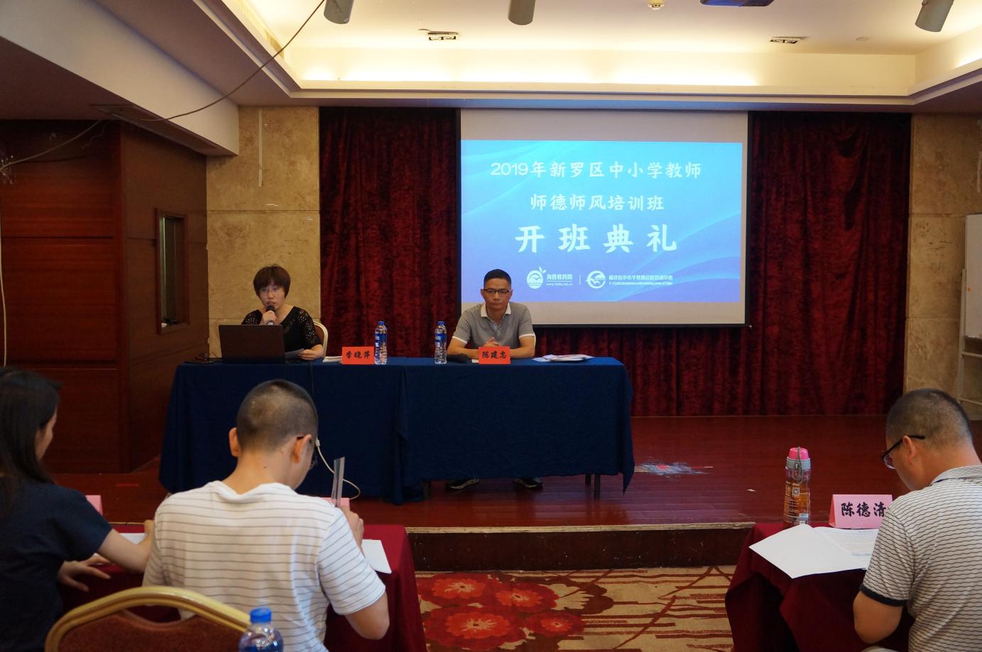 福建广播电视大学海西教育网业务总监李晓萍、新罗区教师进修学校老师陈建忠出席了15日上午的开班式,开班式由海西教育网业务总监李晓萍主持。开班式上李晓萍强调中小学教师师德师风管理的专业发展的重要性及本次培训班的意义,并提出几点要求:一认真学习,提升自我;二加强沟通,互相借鉴;三示范引领,共同成长。