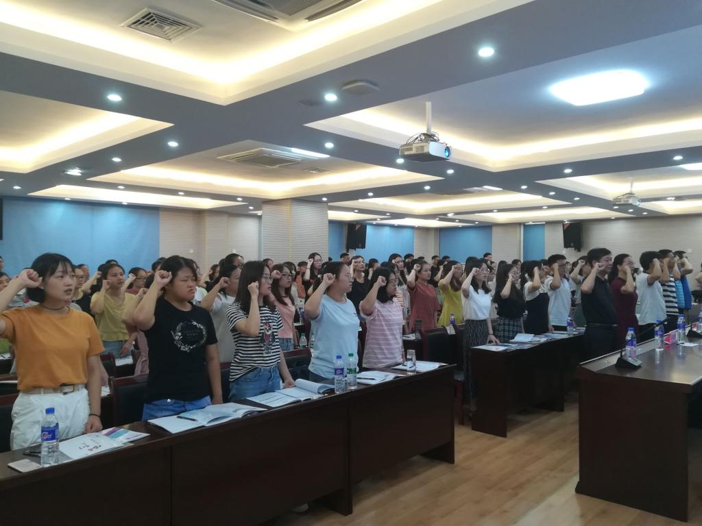 随后进行了开班仪式的第三项议程——新教师宣誓仪式。一百多名年轻有活力的青年教师在五星红旗的见证下,慷慨激昂地许下誓词。