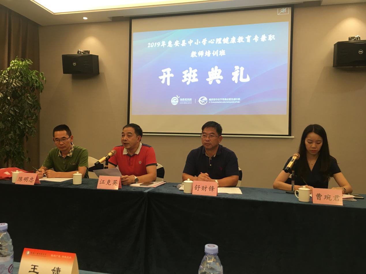 10月15日上午,2019年惠安县中小学心理健康教育专兼职教师培训班开班仪式在漳州拉开帷幕,本次培训由福建广播电视大学培训学院与惠安县教师进修学校联合举办。福建广播电视大学培训学院院长江克英,惠安县教师进修学校校长舒财锋、惠安县教师进修学校培训部主任陈明忠和来自惠安县的中小学心理健康教育专兼职教师共计61名学员出席了开班仪式。仪式由福建广播电视大学培训学院曹琬君主持。
