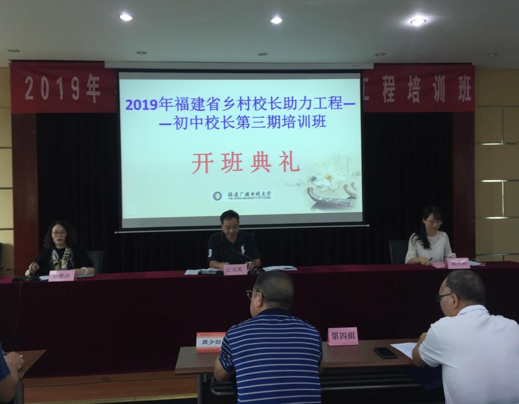 10月18日上午,福建省乡村校长助力工程中学第三期培训班在福建广播电视大学左海校区举行开班仪式。福建广播电视大学培训学院院长江克英、福建广播电视大学培训学院副院长欧雅洪、福建广播电视大学培训学院培训科副科长熊月林以及来自全省各地的乡村中学63名校长参加了开班式,仪式由欧雅洪主持。