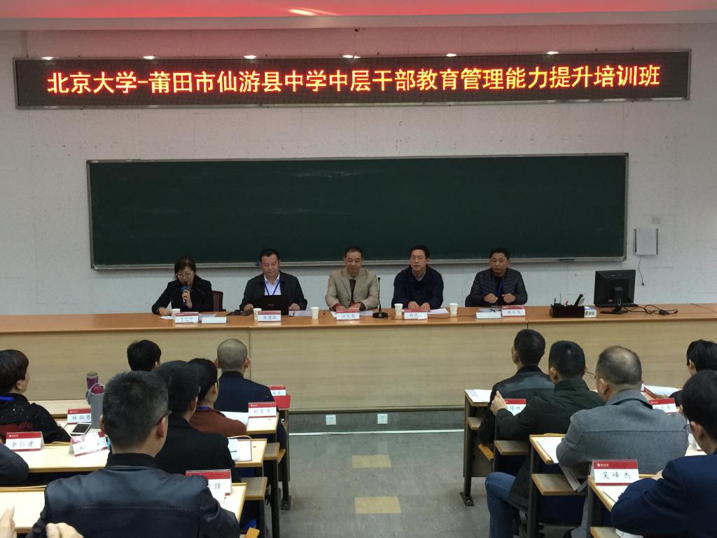 11月12日,北京大学-莆田市仙游县中层干部教育管理能力提升培训班在北京大学燕园校区举办开班仪式。北京大学继续教育学院常务副院长舒忠飞、福建电大培训学院院长江克英、仙游县教师进修学校副校长黄建辉、教导主任黄兴伟参加了本次开班仪式。开班仪式由北大继教院华南大区项目部李俊杰主任主持。此此培训班由仙游县与福建电大海西教育网联合举办,并首次委托北京大学继续教育学院承办,参训学员共计52名。