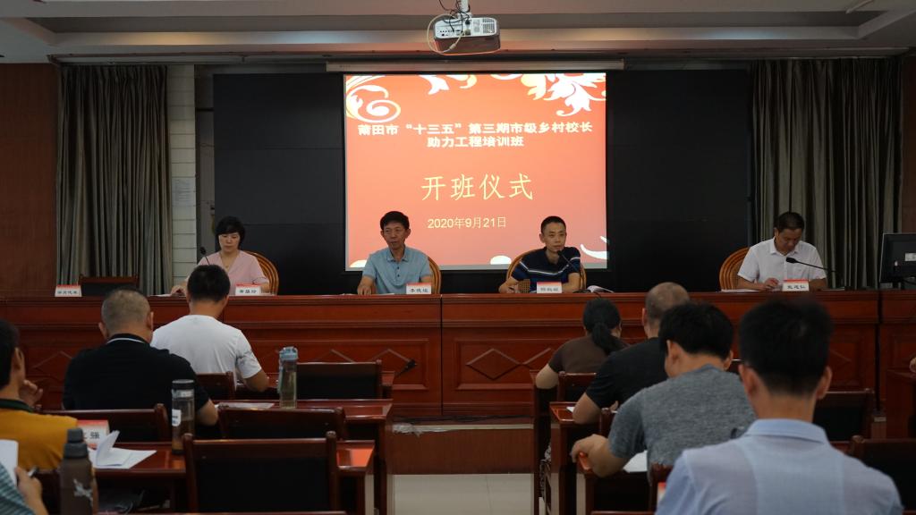 为了提升校长的专业素养,促进城乡教育均衡发展,9月21日上午,莆田市“十三五”第三期市级乡村校长助力工程培训班在莆田举行开班仪式。福建广播电视大学培训学院副院长杨聪颖、莆田市教师进修学院副院长李德煌、莆田市教师进修学院轮训部副主任黄碧玲、莆田市教师进修学院轮训部副主任戴建仁及89位全市乡村中心小学副职校领导、完全小学校级领导参加了开班式,开班仪式由莆田市教师进修学院轮训部副主任戴建仁主持。
