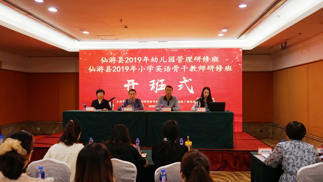 10月26日,由仙游县教师进修学校和福建广播电视大学培训学院联合举办的仙游县2019年幼儿园管理研修班、仙游县2019小学英语骨干教师研修班开班仪式在厦门市翔鹭国际大酒店如期举行。福建省广播电视大学培训学院副院长杨聪颖、仙游县教师进修学校书记张开发、仙游县教育局初幼教股股长傅黎晖以及仙游县幼儿园园长、保教主任、教研员52人和仙游县小学英语骨干教师51人参加了开班式。仪式由福建广播电视大学培训学院面授部主任曹琬君主持。