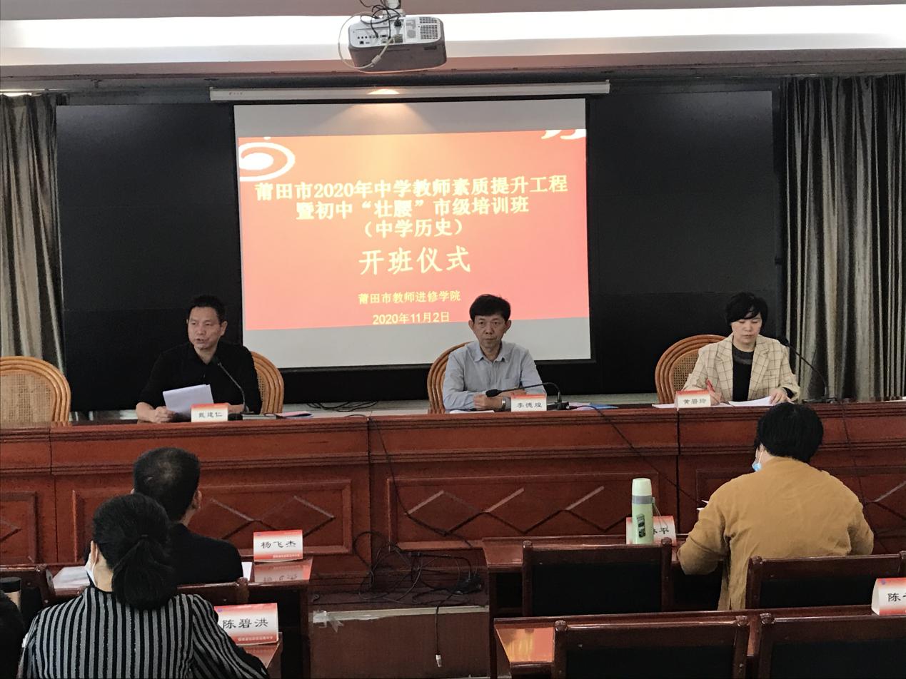 2020年11月2日,由福建广播电视大学培训学院和莆田市教师进修学院联合举办的2020年初中教师(中学历史)素质提升工程暨初中“壮腰”市级培训班顺利开班。莆田市教师进修学院副院长李德煌、轮训部副主任戴建仁、黄碧玲以及莆田市各区县中学历史教师学员60人参加开班仪式,开班仪式由轮训部副主任黄碧玲主持。
