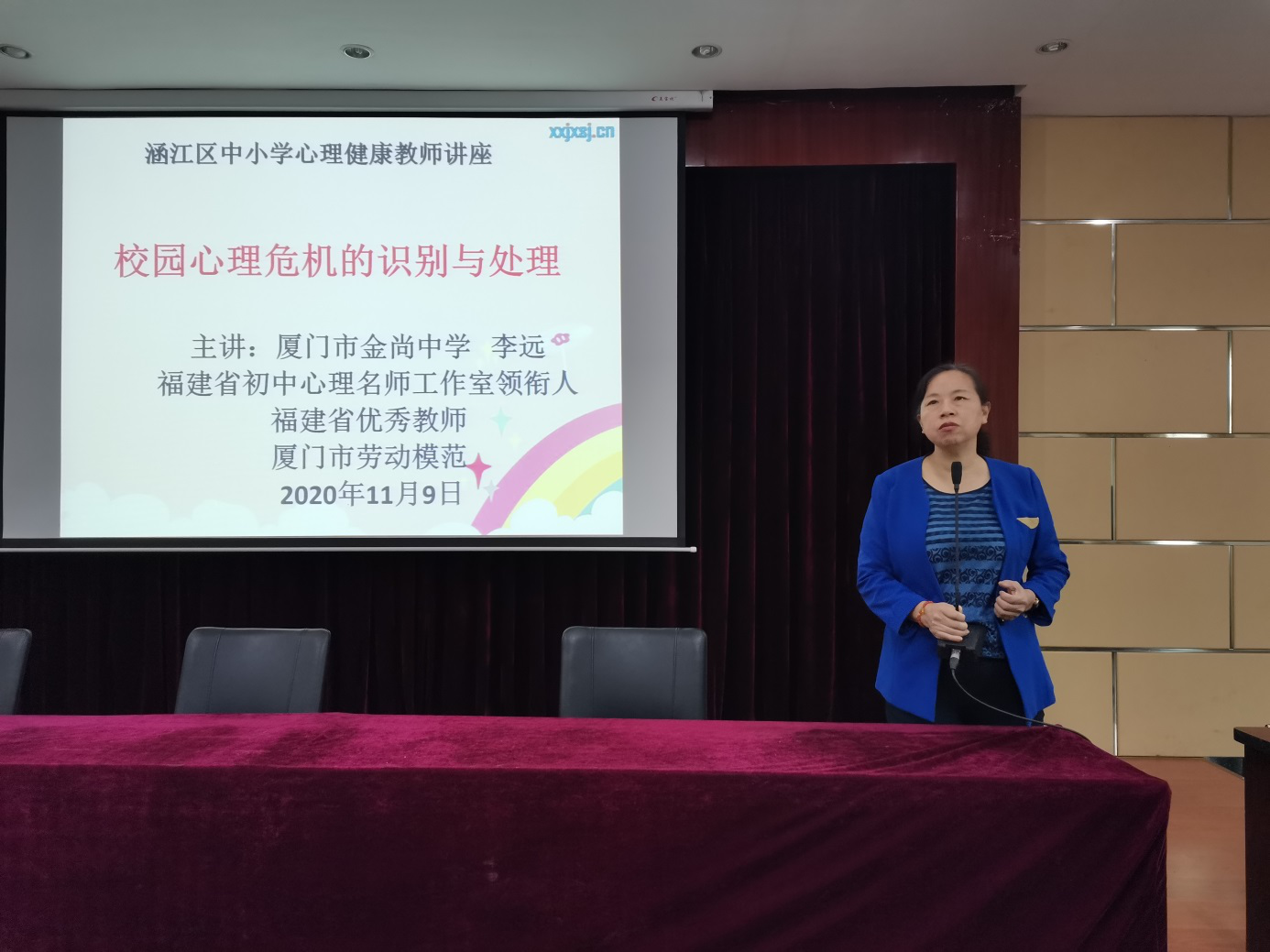 开班仪式后,由厦门市金尚中学心理中心主任李远老师开展《校园危机识别与处理》的专题讲座。