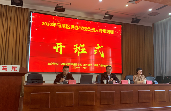 为深入贯彻党的十九大和全国教育大会精神,提高民办学校负责人的综合素养、履职能力和管理意识,造就一支政治过硬、品德高尚、业务精湛、治校有方的高素质专业负责人队伍,2020年11月11日上午由福建广播电视大学培训学院和马尾区教师进修学校联合举办的2020年马尾区民办学校负责人专项培训班顺利开班。马尾教育工委委员胡克晶、马尾区教育局民管办、学前科副科长孔俊及马尾全区民办学校负责人共计70人参加开班仪式,开班仪式由马尾教师进修校副校长姜瑞兴主持。