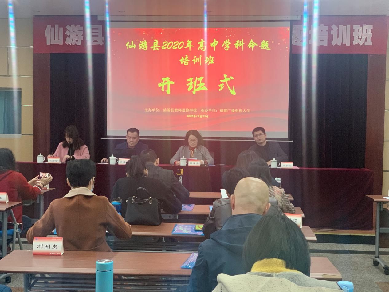 为更好地指导并提高教育质量监测背景下教师的试题编制与组卷能力,全面提高教学质量,12月23日上午,由福建广播电视大学和仙游县教师进修学校联合举办的仙游县2020年高中学科命题培训班在福建广播电视大学拉开帷幕。福建广播电视大学培训学院副院长欧雅洪、仙游县教师进修学校副校长黄建辉、仙游县教师进修学校陈明发老师以及来自仙游县高中数学、政治、生物教师,共计40人出席了开班仪式。仪式由福建广播电视大学培训学院林诗晗主持。