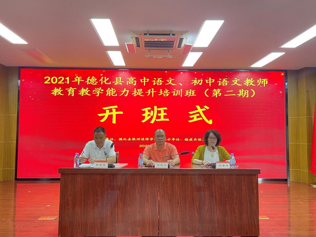 进一步加强初中、高中语文学科教师业务基本技能的锻炼,优化整体素质,增强教师课堂教学能力,提升教学质量,培养语文教师信息技术与学科融合能力,助力语文教师专业成长,优化备考战略,提升试题命制能力,建设一支适应时代要求,业务过硬的高中语文教师队伍。7月20日上午,由德化县教师进修学校和福建开放大学培训学院联合举办的2021年德化县初中、高中语文教师教育教学能力提升培训班在福建船政交通职业学院拉开帷幕。福建开放大学培训学院副院长欧雅洪、德化县教师进修学校校长余德兴、德化县初中、高中语文教师共计104人出席了开班仪式,本次仪式由福建开放大学培训学院李兰贞老师主持。