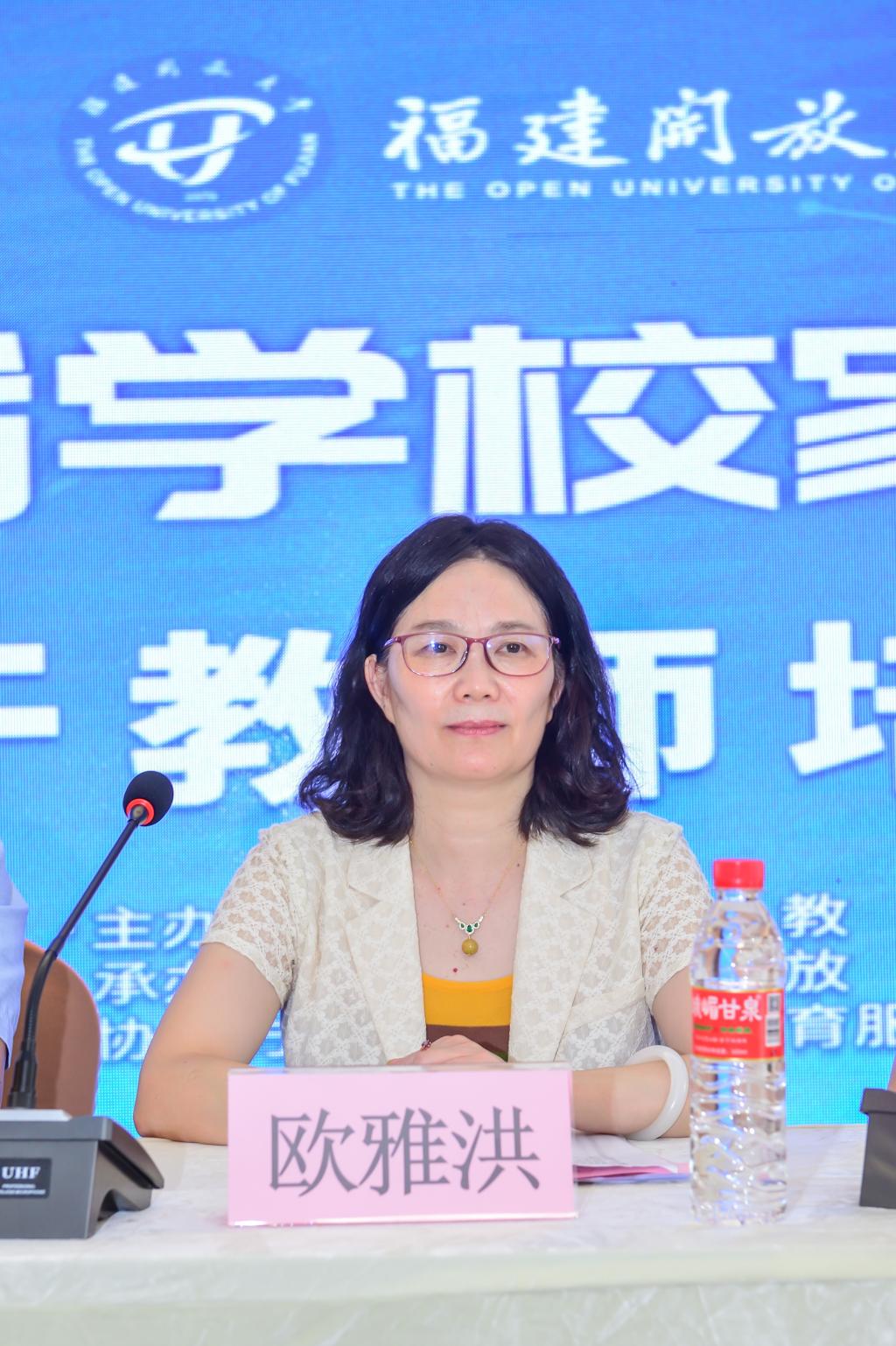 首先,欧雅洪代表福建开放大学对参加本期家庭教育骨干教师培训班的老师们表示热烈的欢迎,对长期以来关心和支持福建开放大学建设发展的省教育厅及全省各级教育局表示衷心的感谢。她以学校的基本情况和办学40多年来的“四个转变”与“四大贡献”为切入点,介绍学校在家庭教育工作领域充分利用信息化手段,通过“线上+线下”相结合方式推进家庭教育的课程培训和考核,深度打造非学历培训新品牌。她强调,本次全省学校家庭教育骨干教师培训项目,是福建省教育厅贯彻落实《中华人民共和国家庭教育促进法》和《福建省家庭教育促进条例》的有益实践,按照省教育厅“百期万名”的工作部署,采取“分批次+分学段”形式,对全省各中小学校、幼儿园、中职学校德育干部、班主任、家庭教育骨干教师及少先队辅导员等进行家庭教育专题轮训。针对本次培训,她寄予四点希望,一要提高认识,珍惜学习机会;二要自我驱动,提升学习主动性;三要遵纪守法,严守培训纪律;四要融汇贯通,强化成果运用。