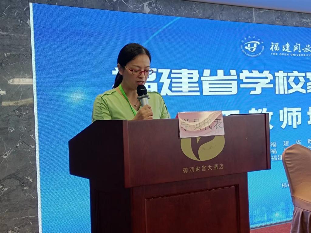 学员代表来自尤溪县城关小学的黄秀容老师代表全体学员发言,她代表所有参培学员表态,要把握难得的培训机会,遵守培训班规章制度,认真学习,掌握更多的家庭教育知识,帮助更多的家庭。